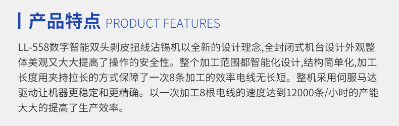 LL-558全數字智能雙頭剝皮扭線(xiàn)沾錫機   產(chǎn)品說(shuō)明:   LL-558數字智能雙頭剝皮扭線(xiàn)沾錫機以全新的設計理念,全封閉式機臺設計外觀(guān)整體美觀(guān)又大大提高了操作的安全性。整個(gè)加工范圍都智能化設計,結構簡(jiǎn)單化,加工長(cháng)度用夾持拉長(cháng)的方式...